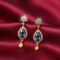 These sophisticated blue stone halo earrings by Shri Aabhushanam are a masterpiece of color and contrast. Each earring features a floral-inspired stud that leads to a prominent pear-shaped sapphire-blue stone, surrounded by a halo of shimmering white accents. A small, stone-set droplet hangs at the very bottom, adding a final layer of elegance to this ethnic jewellery for women. The deep blue hue offers a royal touch, making these earrings an ideal choice for evening receptions, galas, or formal parties. They beautifully complement silver-work sarees or navy blue gowns, bridging the gap between traditional Indian aesthetics and modern gemstone trends. The precision in the stone setting highlights the premium quality and luxury appeal of the brand. Lightweight yet high-impact, these earrings are designed to make a statement while providing comfort. Add a touch of regal charm to your jewellery box with this meticulously crafted pair.
