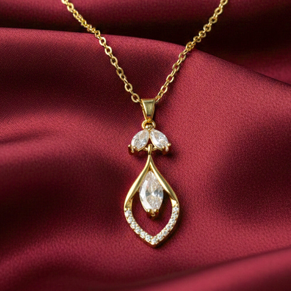 Shri Aabhushanam presents a masterpiece of delicate design featuring a unique vertical drop silhouette. This pendant incorporates three marquise-cut stones arranged in a leaf-like pattern that transitions into a hollow teardrop frame. The bottom curve of the frame is embellished with tiny, light-catching crystals, adding a refined glow to the gold-plated jewellery. This ethnic jewellery for women is inspired by botanical elements, offering a fresh take on traditional motifs. It is versatile enough for both religious ceremonies and evening parties. The craftsmanship highlights the brand’s commitment to quality and detail. For a complete look, style this piece with an embroidered lehenga or a chic chiffon saree. As a staple of Indian jewellery, it brings a touch of femininity and grace to any ensemble, making every occasion feel special and well-celebrated.
