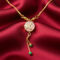 This enchanting necklace from Shri Aabhushanam features a soft, rose-tinted central stone that radiates a gentle feminine glow. Topped with a delicate golden floral overlay and suspended from a beaded golden chain, this piece is a beautiful example of ethnic jewellery for women. The pendant is finished with two playful hanging tassels featuring green and gold beads, adding a pop of color and traditional charm. The warm gold-plated finish enhances the pastel tones of the stone, creating a piece that feels both vintage and fresh. It is an excellent choice for daytime events, garden parties, or festive luncheons. Shri Aabhushanam combines traditional motifs with unique color palettes to create jewellery that tells a story. Pair this with a floral organza saree or a pastel salwar suit to highlight the delicate craftsmanship and soft hues of the pendant.