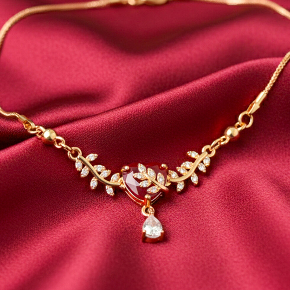 The Ruby Heart Leaf Necklace by Shri Aabhushanam is a romantic blend of nature and elegance. At its center lies a rich red heart-shaped stone, accented by delicate crystal-studded leaves and a shimmering pear-cut drop. This gold-plated jewellery piece is a testament to fine detailing and artistic design. The balanced arrangement of stones creates a sophisticated look that is perfect for special occasions such as anniversaries or intimate celebrations. As part of our ethnic jewellery for women, it bridges the gap between traditional motifs and romantic modernism. The golden chain is sturdy yet refined, ensuring the pendant remains the focal point of your attire. Style this piece with a sweetheart neckline dress or a traditional silk blouse to accentuate its unique shape. Shri Aabhushanam jewellery offers timeless appeal, making this necklace a cherished part of your jewellery box for years to come.