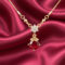 Radiate regal charm with the Ruby Red Drop Necklace from Shri Aabhushanam. This striking piece features a brilliant, faceted red stone shaped like a teardrop, suspended from a glittering floral cluster. The gold-toned chain is accented with small golden beads, adding a touch of traditional jewellery flair to the overall design. This gold-plated jewellery piece is inspired by the grandeur of Indian heritage, making it a perfect accessory for weddings and grand celebrations. The deep red hue of the stone provides a bold contrast against the gold finish, ensuring it stands out against any outfit. For a classic ethnic look, pair this necklace with a rich red or gold saree. The exquisite detailing and vibrant color make it a must-have for any woman looking to add a touch of royalty to her ensemble.